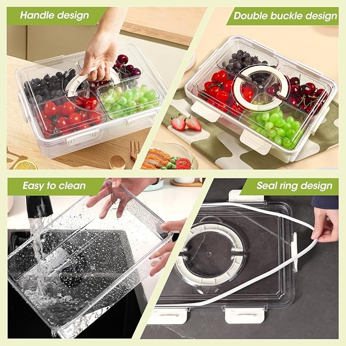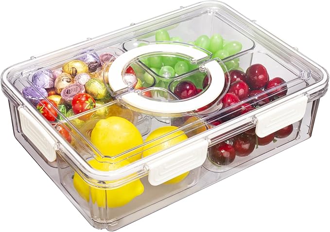 Divided Serving Tray with Lid & Handle, 4 Compartment Removable Snack Box, Kitchen Organizers and Storage, Snackle Box Container, BPA-Free Fruit Storage Container for Berry, Snack, Candy, Nuts…