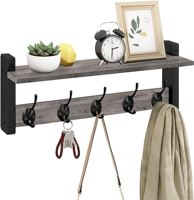 - 2-IN-1 DESIGN: The 4.52" deep floating shelf provides ample space for decorative items while featuring 5 dual metal hooks for practical hanging storage in your entryway or hallway. Showcase photo frames, a potted plant, or decor on the upper shelf