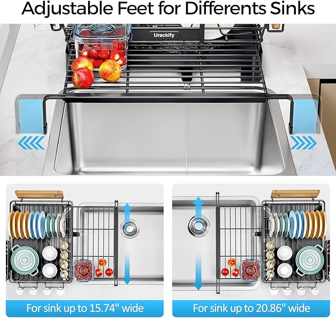 - Expandable Adjustable Feet: This dish drying rack features adjustable legs extending from 15" to 23" that easily accommodating different sinks. The built-in fence ensures secure drying of large stuff on the rack and prevents them from tipping or sliding into the sink