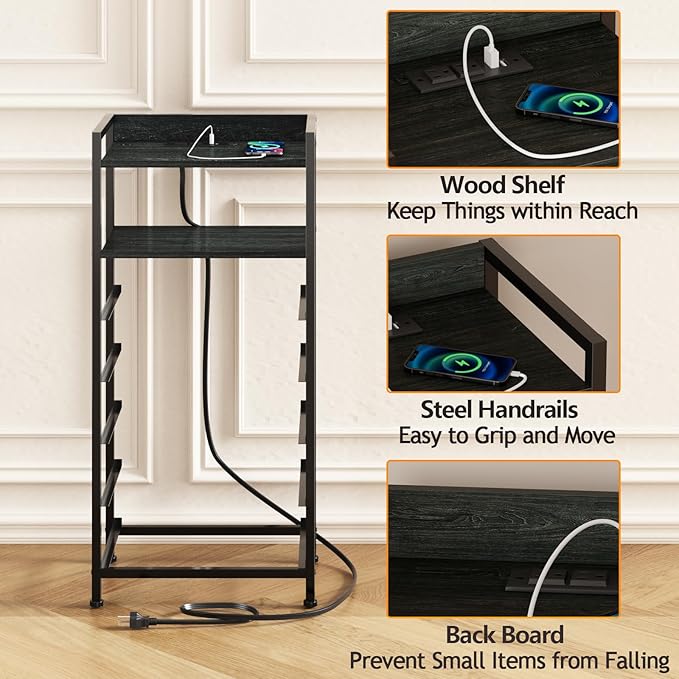 - Sturdy Structure: Constructed from high-quality materials, this nightstand with charging is durable and long-lasting. The overall frame is made from metal and the shelf is wooden. And the anti-toppling device is provided to help to reduce the risk of injuries, especially important in households with children or pets.