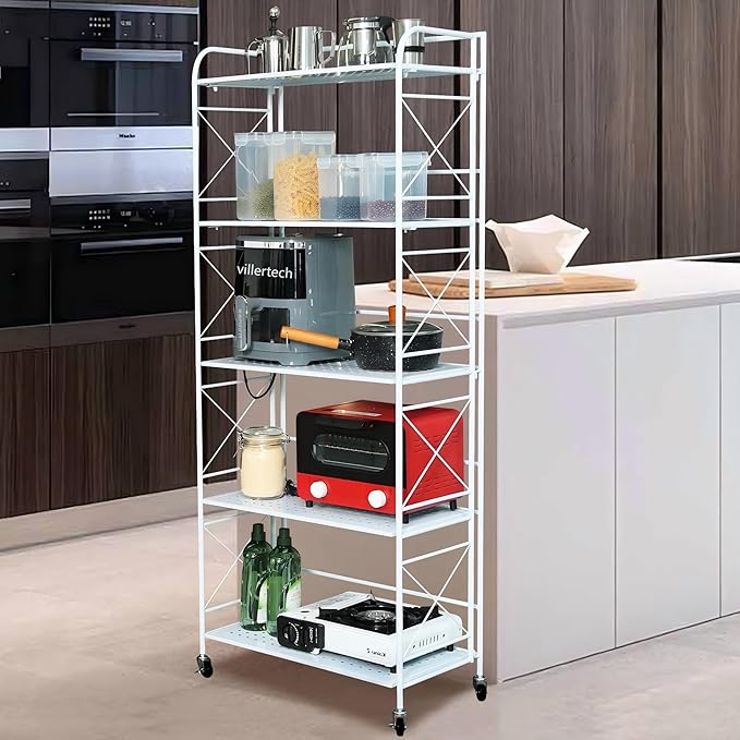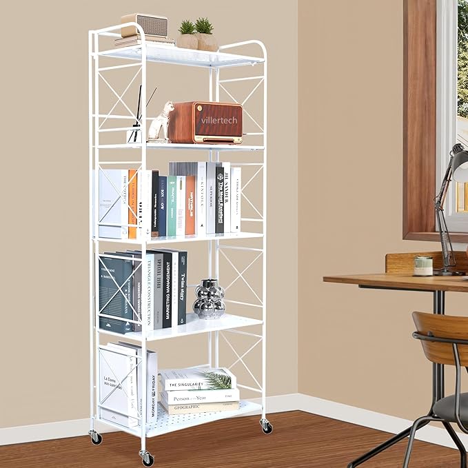 Foldable 5-Tier Metal Shelf with Wheels - Folding Bookshelf Unit for Living Room, Kitchen, Study 12.6" D x 23.6" W x 57.0" H, Glossy White