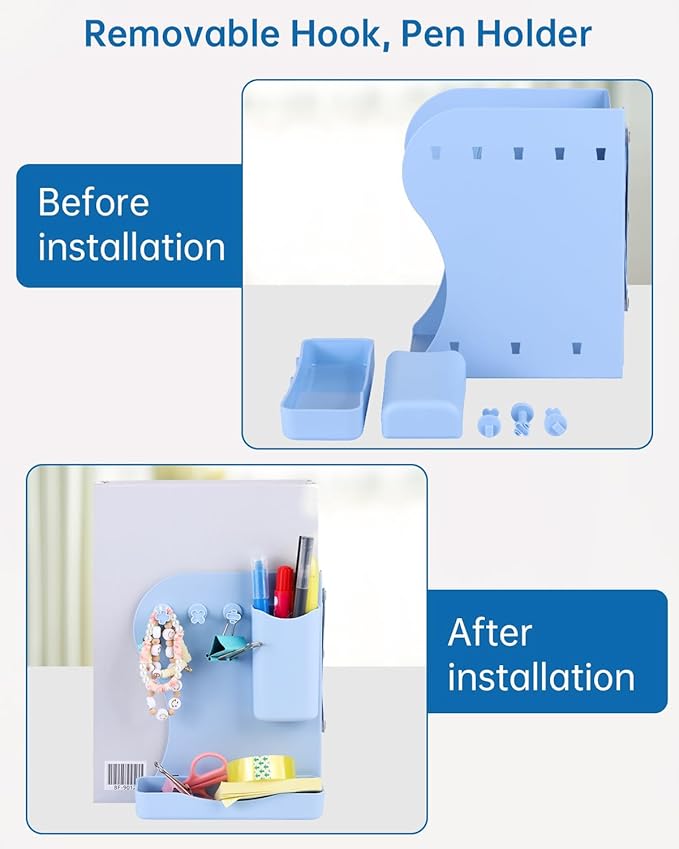 Honagu Adjustable Bookends, Metal Book Ends for Shelves Heavy Book, Desk Magazine File Organizer for Home, Office, Books, Papers with Removable Hook, Pen Holder(Light Blue)