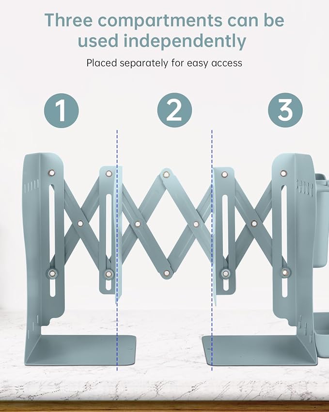 - 【Effortlessly Organize Your Space】- With 3 independent spaces, this bookend can be adjusted from 4.6 to 18.9 inches, allowing you to discernibly organize magazines, binders, files, and other items on your desk, thereby keeping them tidy and easily accessible.