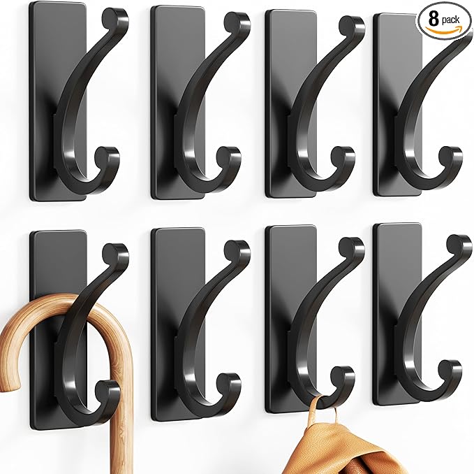 Adhesive Wall Hook for Towel/Coat - Extra Sticky 10LB Stainless, Stick on Hanger for Bath or Shower, Matt Black 8-Pack