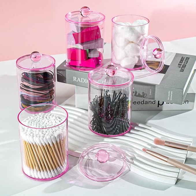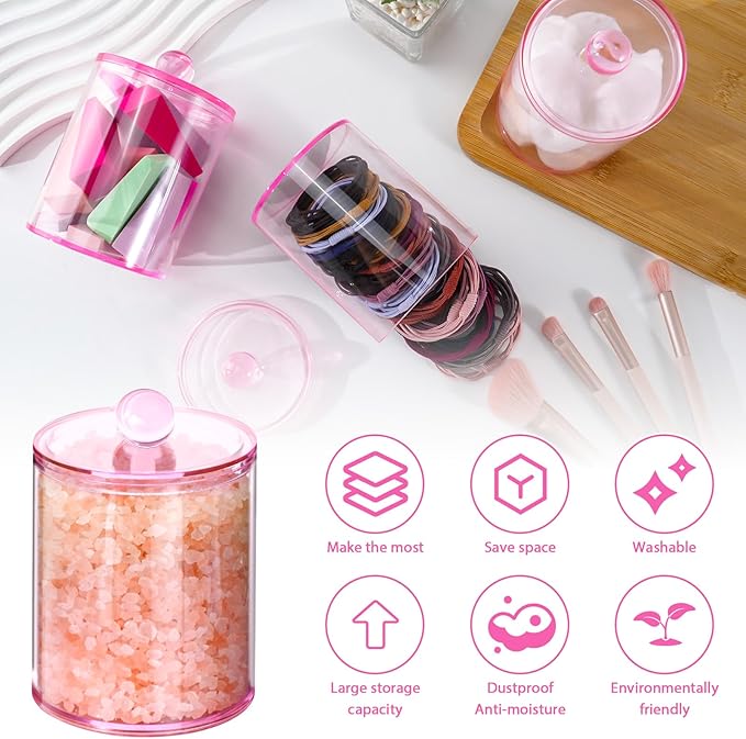 4 Pack Qtip Holder,Canister Apothecary Jar Set, Bathroom Jars with Lids Set for Cotton Swabs, Balls, Pads, Floss Picks,10oz-12oz Plastic Canisters Restroom Bedroom Vanity Organizer(Pink)