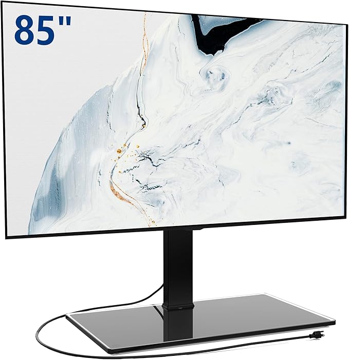 - UNIVERSAL TV STAND for 50''-85'' - FITUEYES TV stand fit most 50-85inches LCD/LED/OLED Flat/Curved panel screen or monitor for Sony/Samsung/Sharp/TCL/ LG etc. Universal TV stand/base tabletop stand to mount your TV and AV components on an entertainment center or a desk/table. 10 mm thick sleek tempered glass shelf can store your cable tv box, satellite receiver, gaming consoles such as PS4, Xbox, or Apple TV