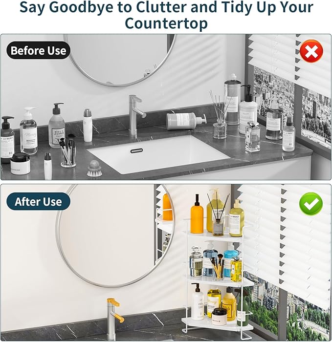 - Space-Saving Corner Bathroom Counter Organizer: 3-tier bathroom corner organizer has a unique 90-degree corner design, and can prefect use usually underused corner space. Save your counter space, keep your space organised and clutter-free, with countertop items easily accessible.