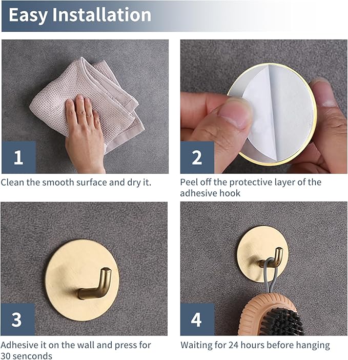 - 【 Waterproof Heavy Duty Sticky Wall Hooks 】Made of high quality of 304 stainless steel. Able to resist daily scratches, corrosions, tarnish and rust. Those circle stick on hooks use strong adhesives, the maximum load-bearing capacity is 14lbs.
