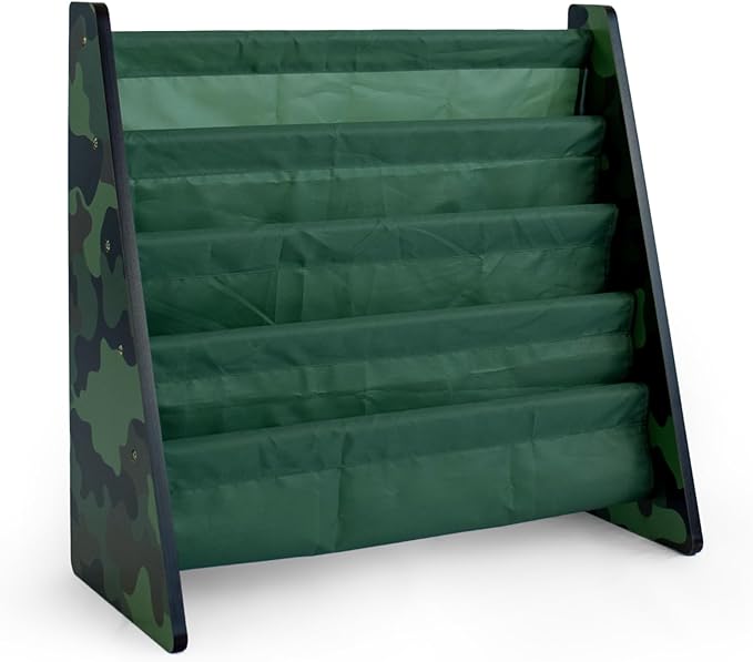 Humble Crew 4-Tier Kids Bookshelf, Camo Wood/Green - Premium Book Shelf for Kids Rooms with Four Deep Pockets - Toddler Sling Book Rack with Deep Sleeves, Nursery Bookcase Organizer