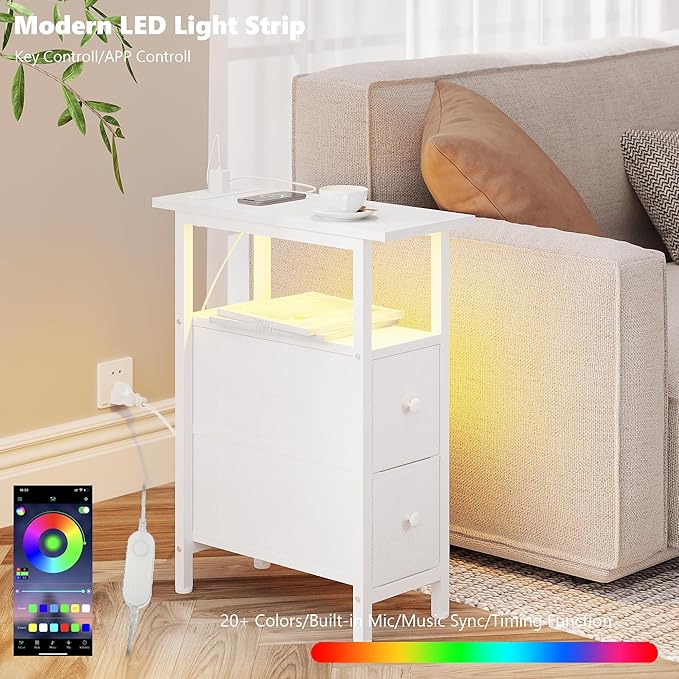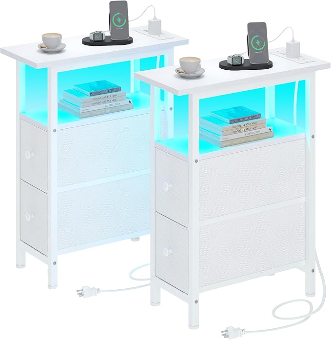 End Table Set 2 with Charging Station, Narrow Side Table with 2 Fabric Drawers, Skinny Nightstand with LED Light, Slim Bedside Table for Bedroom, Living Room, Small Spaces, White
