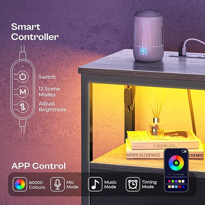 - 【Nightlight and Room Ambiance】With a smart controller, choose from 12 scene modes, 5 adjustable speed levels, and 3 brightness settings or smartphone app with over 60,000 colors, set timers, music and mic mode. Whether you need a gentle nightlight or want to create the perfect mood, this LED nightstand’s LED lights offer versatile lighting options that give room just the right amount of light to sleep with