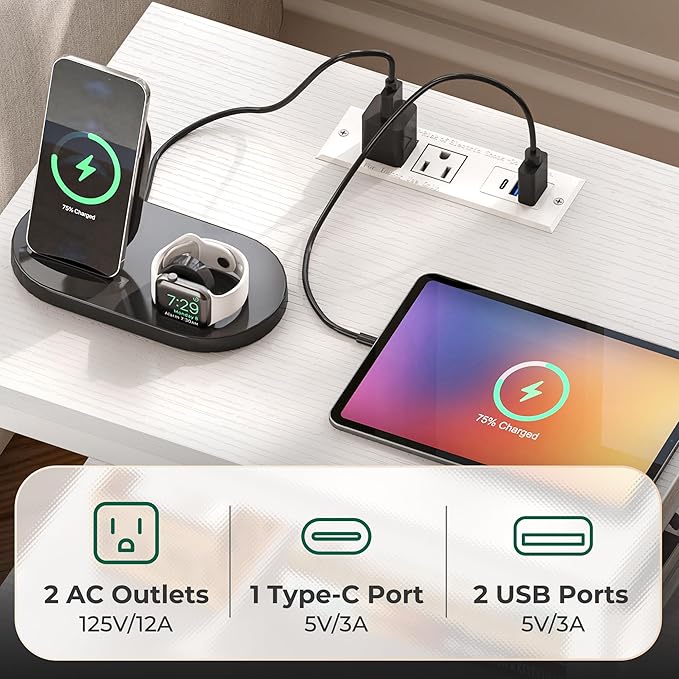 - 【Nightstand with Charging Station】This modern nightstand is equipped with 2 AC outlets, 2 USB ports, and 1 Type-C port, providing ample charging options right at your bedside. Whether you need to plug in your phone, tablet, or other electronic devices, this white night stand ensures you wake up to fully charged gadgets every morning