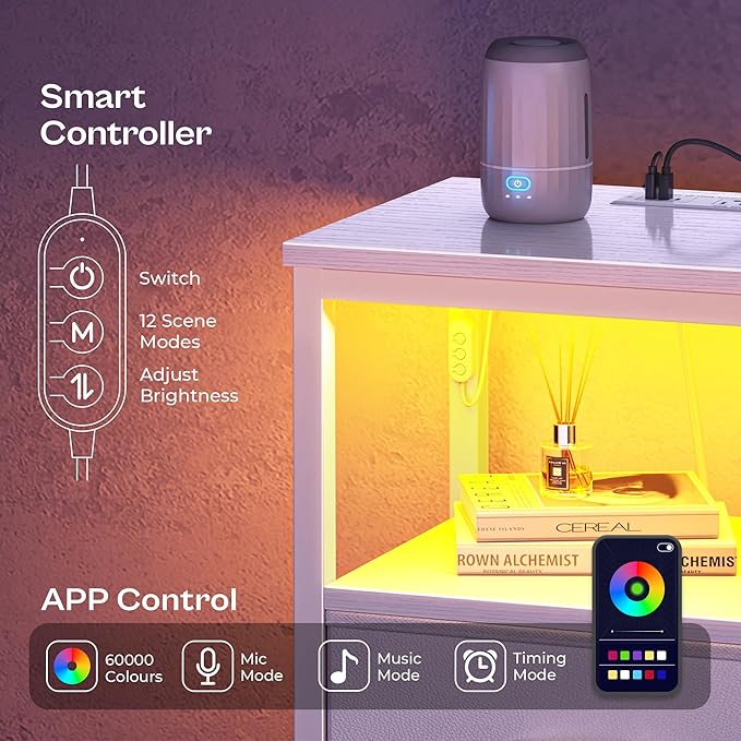 - 【Nightlight or for Room Ambiance】With a smart controller, choose from 12 scene modes, 5 adjustable speed levels, and 3 brightness settings or smartphone app with over 60,000 colors, set timers, music and mic mode. Whether you need a gentle nightlight or want to create the perfect mood, this LED nightstand’s LED lights offer versatile lighting options that give room just the right amount of light to sleep with