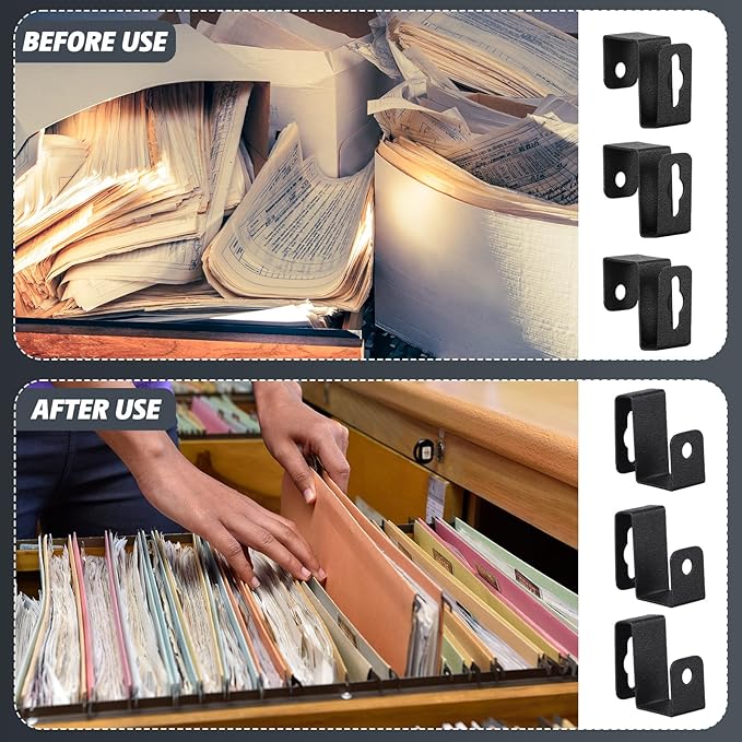 - Save Space: clear up your desk and save space with our metal hanging file brackets; Their black design allows you to suspend your files, decluttering your workspace and offering an organized view that boosts productivity