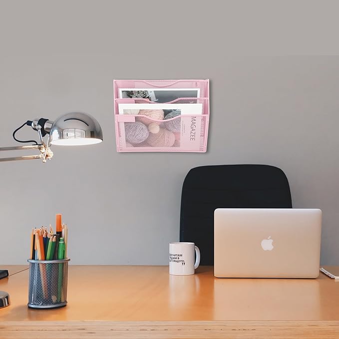 EASEPRES 3 Pocket Mesh Hanging Wall File Organizer, Wall Mounted Mail Paper Document Folder Holder, Clipboard Storage Organization Magazine Rack with Nametag Label for Office Home School, Pink