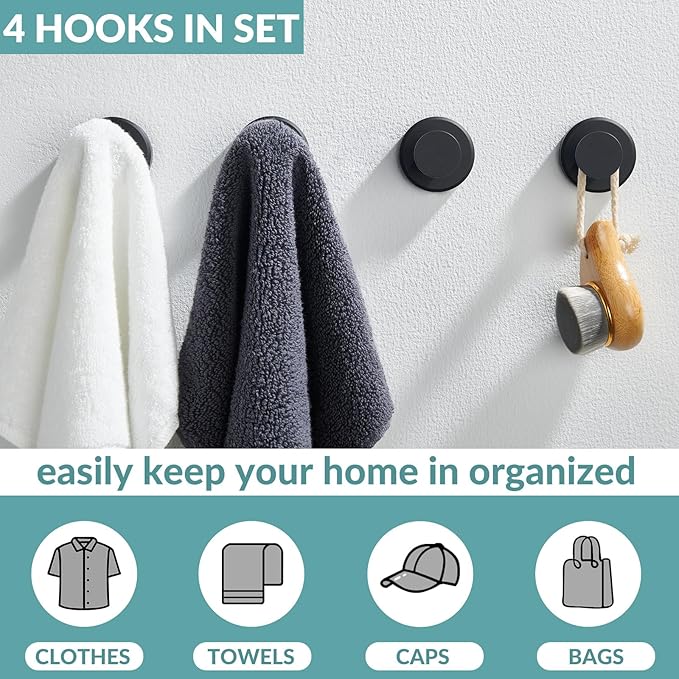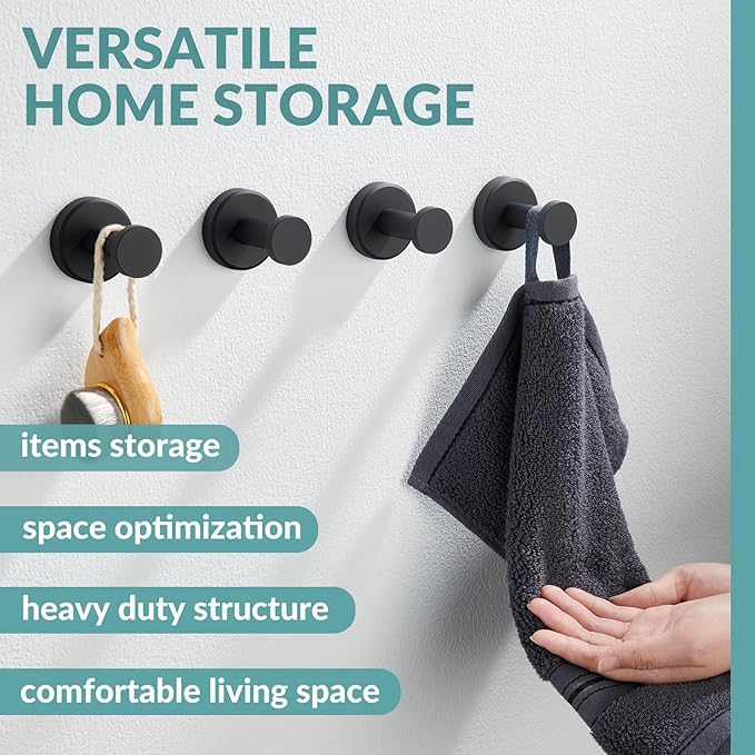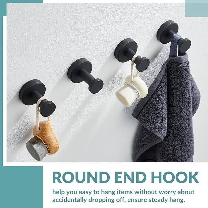 APLusee Matte Black Bath Robe Towel Hook 4 Pack, Stainless Steel Bathroom Coat Hook, Wall Mount