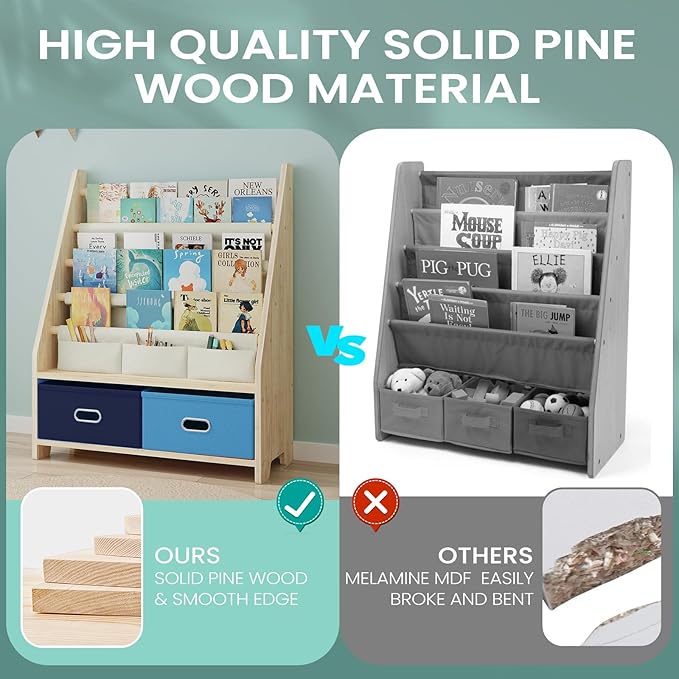 - NATURAL SOLID WOOD: Not like Melamine MDF as unpleasant smell, easily broke and bent, the broken residue will hurt children, this kids bookshelf is selected with high-quality natural solid pine wood which can completely eliminate these problems, it's durable and safe; paint-free design without any irritating and harmful odor.
