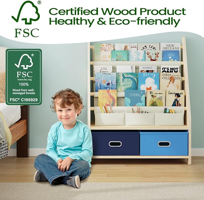 - Durable2-IN-1 LARGE STORAGE: Kids Bookshelf with Toy Storage Organizer is not only a kids 4-tier sling bookshelf rack, but also with 2 pcs, different color fabric drawer for toy storage organizer, got large capacity storage space. Kids, children and toddlers can storage books, toys, pens and anything they want, helps kids learn and practice organization and clean-up skills.