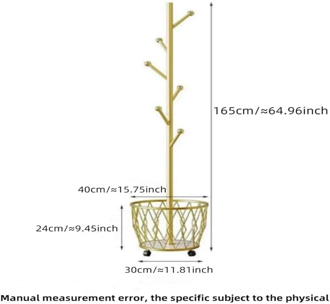 Freestanding Metal Coat Rack Stand with Basket Modern Organizer for Scarf Jacket Hat Bags Ideal for Home Entryway Bedroom Corner Stable and Moveable tree (gold)