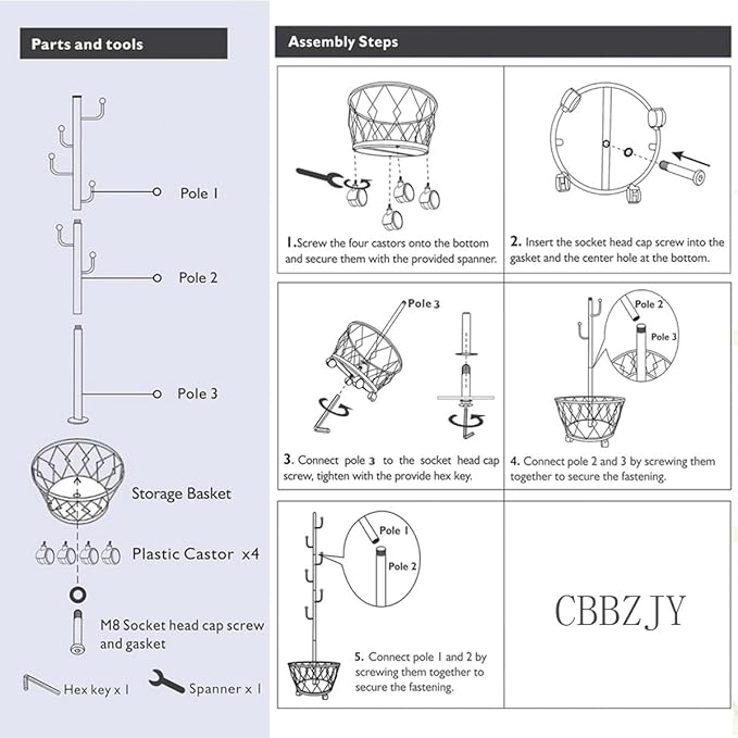 - VERSATILE DESIGN: This freestanding coat rack features a sturdy metal construction with 6 double-pronged hooks, a large basket, and 360° rotation for convenient access.