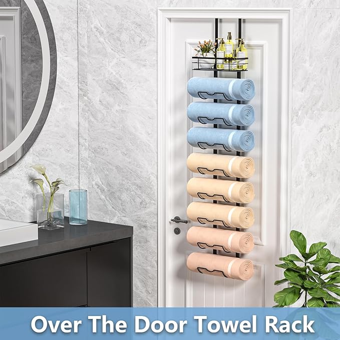 9-Tier Over The Door Towel Rack,Towel Racks for Bathroom, Metal Towel Holder with Storage Basket,Towel Storage for Small Bathroom,Towel Rack for Rolled Towels,Black