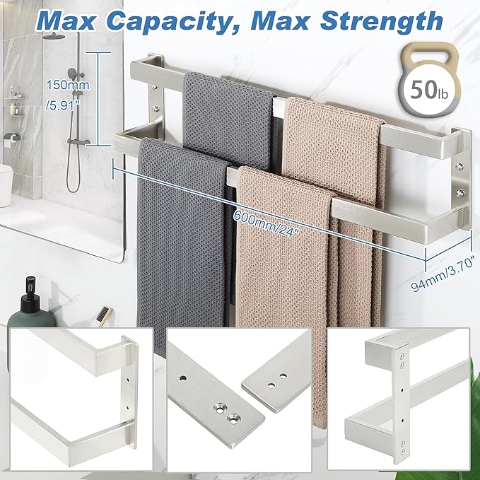 Alise Double Towel Bar 24", SUS304 Stainless Steel Towel Racks for Bathroom Wall Mounted, Heavy Duty Bathroom Towel Holder, Space Saving Towel Hanger, Brushed Nickel