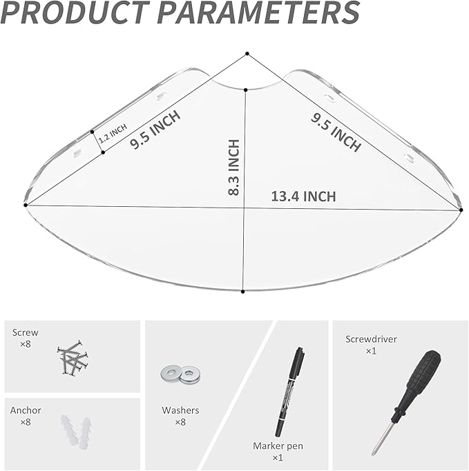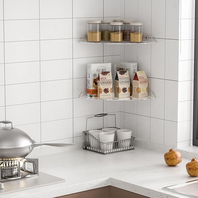 - Space Saver: The acrylic corner wall shelf is a perfect space saver in your house. Wall mounting design will help you to organize your toiletries, figures, books, cosmetics, skincare, perfume or spice jars very well. You will get more space in your house. Say goodbye to mess!