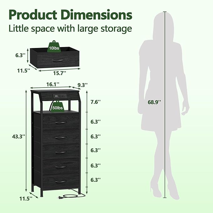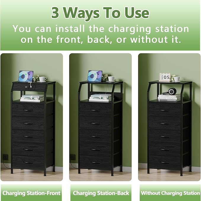Furnulem 5 Drawers Dresser with Charging Station, Fabric Chest of Drawers with Open Shelf, Tall Night Stand, Bedside Table for Closet, Entryway, Bedroom Furniture, 3 Ways to Use, Black Oak
