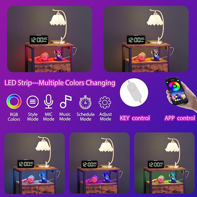 - 【Smart RGB LED】Enhance your bedroom ambience with our Furnulem nightstand with wood shelf. Equipped with a smart RGB LED light strip, this nightstand offers over 60,000 colors to choose from. Whether you prefer a relaxing mood or want to match your room decor, you can easily adjust the brightness and color using the button or mobile app. With modes like Style Mode, Music Mode, Microphone Mode, and Timer Function, you'll have endless possibilities to create the perfect lighting atmosphere.