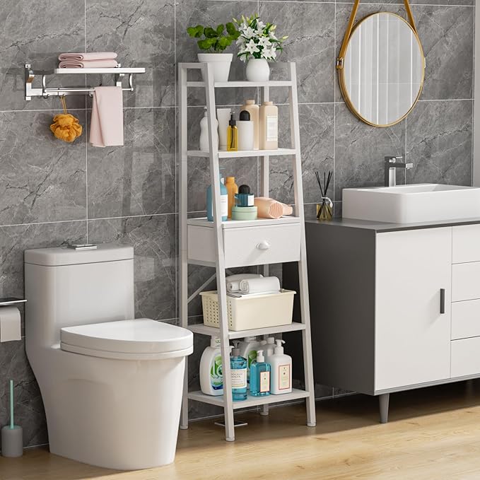 Furologee 5 Tier Bookshelf, Ladder Shelf with Drawer, Tall and Narrow Bookcase, Storage Shelves Organizer,Industrial Display Standing Units for Bathroom,Kitchen,Bedroom,Living Room,White