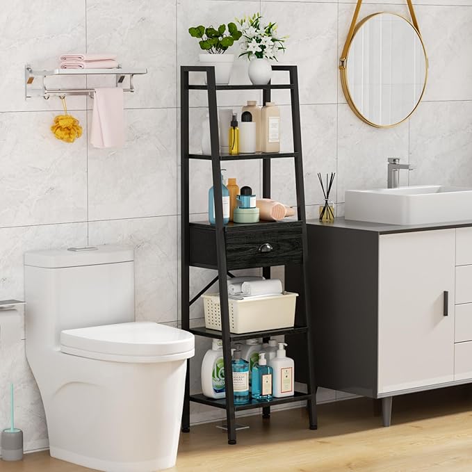 Furologee 5 Tier Bookshelf, Ladder Shelf with Drawer, Tall and Narrow Bookcase, Storage Shelves Organizer,Industrial Display Standing Units for Bathroom,Kitchen,Bedroom,Living Room,Black Oak