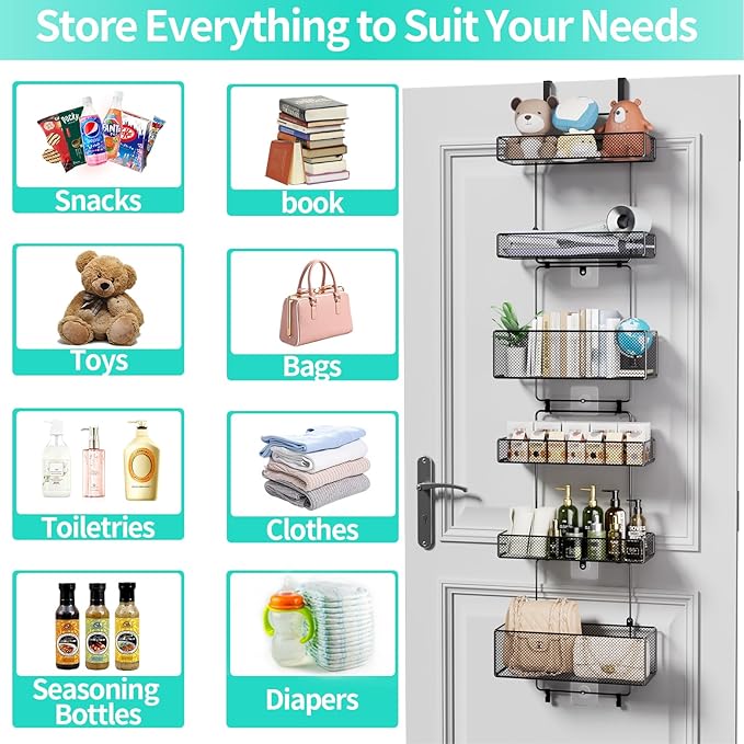 - [Large Capacity for Maximum Storage]: Maximize your storage potential with the behind the door storage's large capacity design. With six spacious tiers, our closet hanging organizer has 2 large-capacity baskets and 4 standard-capacity baskets,you can store a wide range of items, from toiletries and cleaning supplies to toys and kitchen essentials. This generous capacity of the closet door organizer ensures that you have ample space to keep your home organized and clutter-free, no matter what you need to store