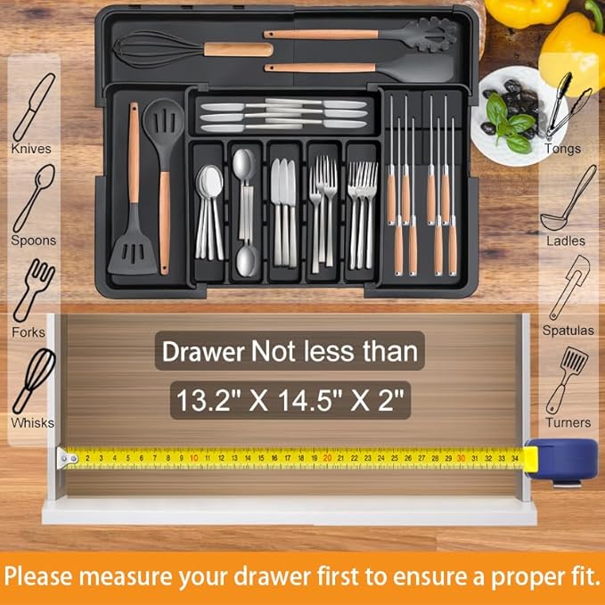 - Adjustable Length and Width: Exclusive Patented Adjustable System – Unlike conventional silverware drawer organizers, our top-expandable silverware organizer features both ways adjustment from 13.2" to 22" in width (W) and 14.5" to 19" in depth (D), height is 2", with modular dividers for precision drawer storage. Please note that your drawers interior measure at least 13.2"W x 14.5"D x 2"H” (Pls measure drawer size before ordering)