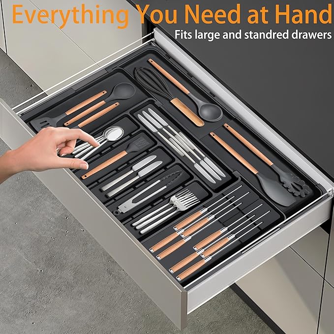 - Considerate Design: Worried about your utensil tray sliding around in the drawer? Fear not! Our kitchen organizers and storage features anti-slip bases on all four corners, keeping items securely in place and preventing unnecessary movement. The buckle design facilitates smooth sliding and effortless adjustment
