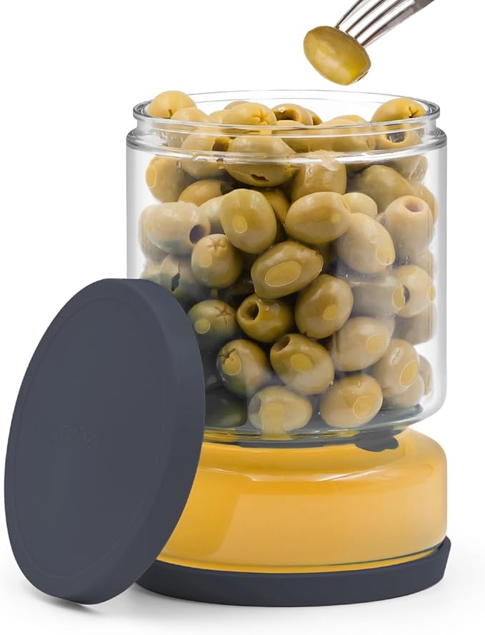 - Sturdy Construction: The food container is made of durable and friendly Borosilicate Glass, which also gives a clear view of the food; the lids and the strainer are made of BPA-free; these make this olive jar dishwasher safe and fridge safe