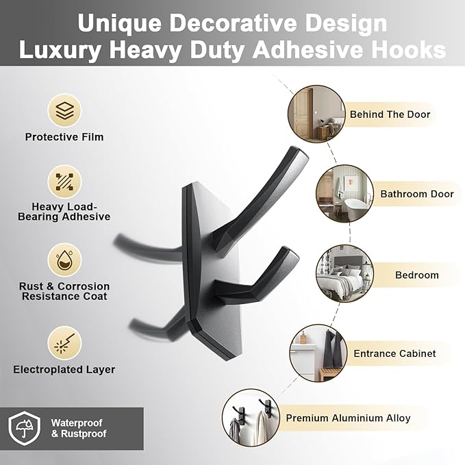 - NO DRILLING: Robe and towel heavy duty adhesive hooks are self-adhesive, suitable for hanging robes, towels, hats, keys, jackets, and coats without drilling holes and can be removed cleanly.