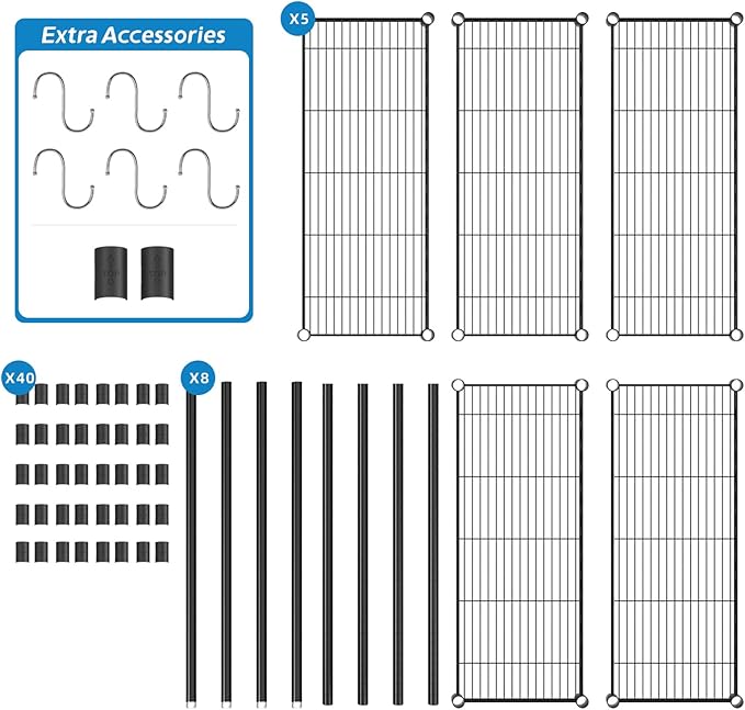 - What You Will Get: This Wire Shelving include: 5 pieces of Metal Mesh Board, 4 pcs Upper Pole,4 pcs Bottom Pole, 40 pcs Clips; Additionally, an additional 2 clips and 6 metal hooks are included