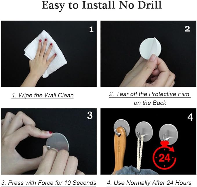 - Bathroom Hooks For Towels No Drill Required: Peel off the self-adhesive layer, press, and attach the hooks for walls no damage to smooth surfaces without gaps. Not suitable for painted walls or wallpaper; Allow 24 hours for the adhesive to set before hang;