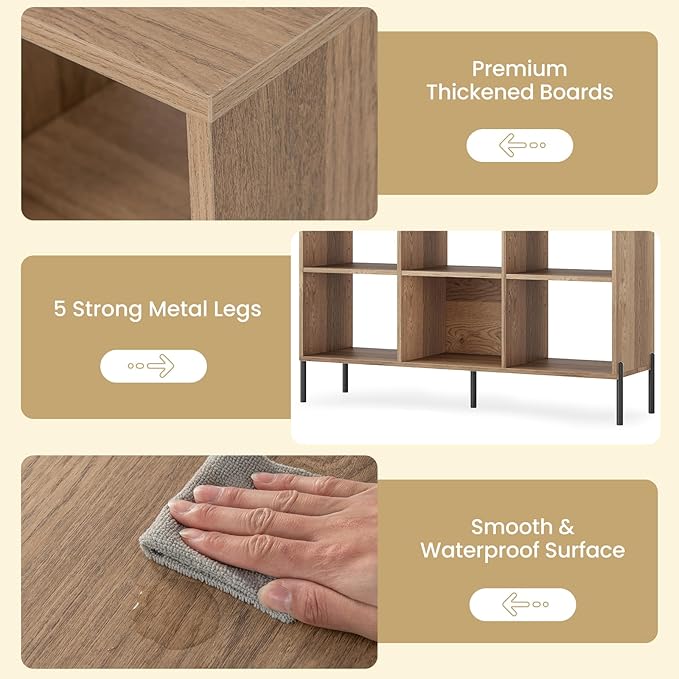 - 【Ample Storage Space】Equipped with 6 spacious cubes and a large top, this book shelf offers abundant storage for books, decor, and essentials. It enables easy organization and quick access to items.
