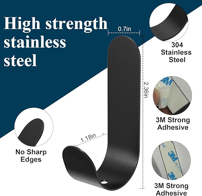 - 【Premium Material & Heavy Duty】ATDOALL adhesive wall hooks for hanging are made of premium and thickened 304 stainless steel, no sharp edges, are rustproof and heavy-duty, won`t be deformed easily, and we prepared powerful 3M stickers, which make these shower hooks can stand with 12lbs weight, In addition, the size of hooks is 6x1.8x3cm, the 3cm large opening design allows hanging the large things, such as towels, coats, hats, kitchen amenities and etc, it`s a must-have home amenities.