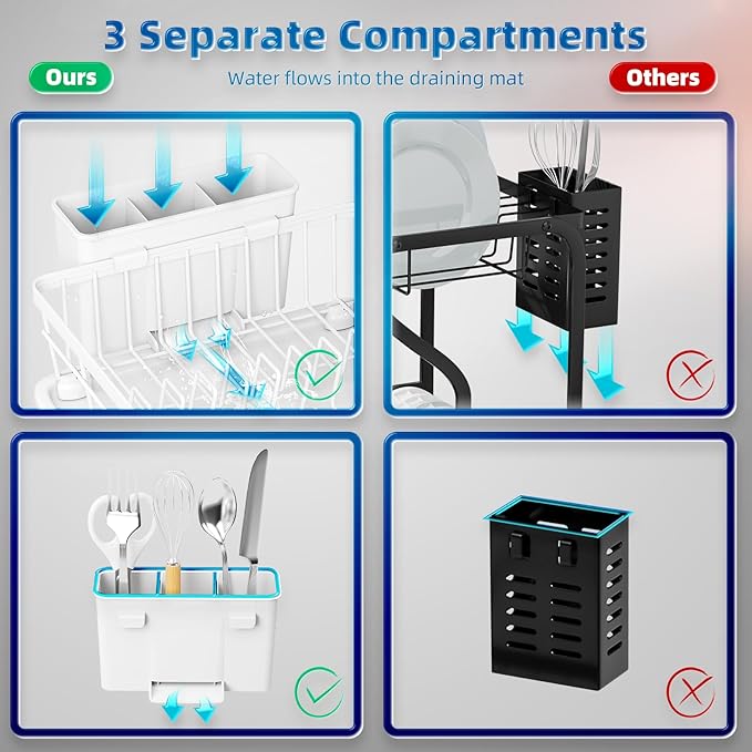 - HIGH-QUALITY MATERIAL: GAOKASE dish drying rack is made of high-quality metal, and the surface is covered with anti-rust coating, which can prevent the dish drying rack from rusting and deformation, Ideal for long term use in the kitchen. Make your kitchen work easier.The cutlery rack is designed to save 40% of your storage space.