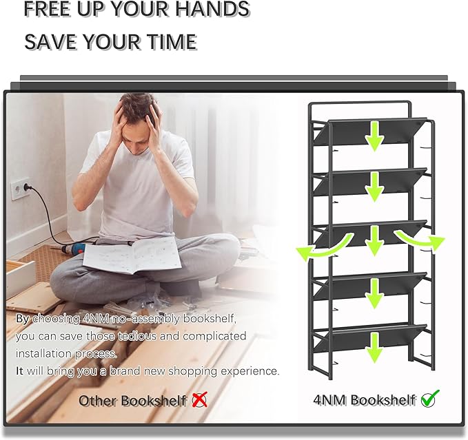 4NM No-Assembly 5 Tiers Folding Bookshelf Storage Shelves Vintage Bookcase Standing Racks Study Organizer Home Office (All Black)