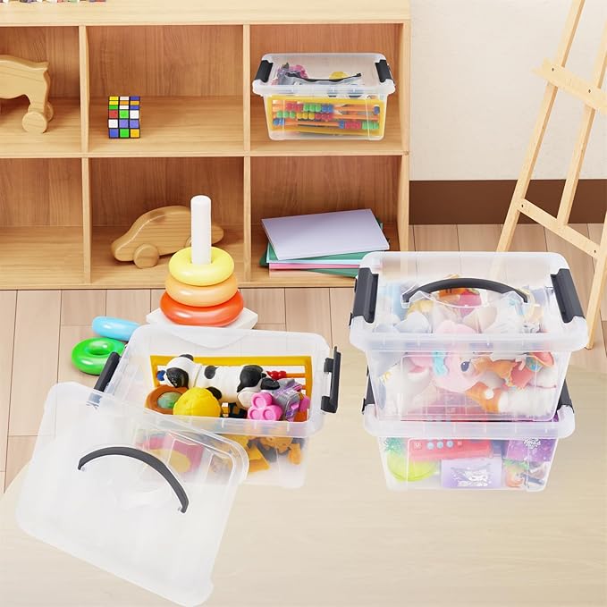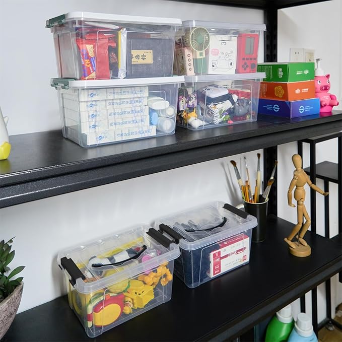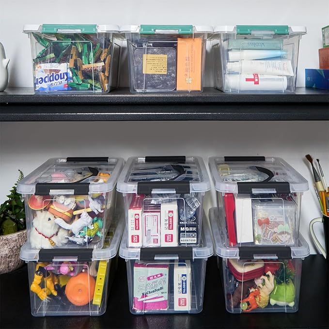 6 Quart Plastic Stackable Storage Latch Bins,Clear Latching Box with Handle and Lid,Pack of 6 (Black Handle)