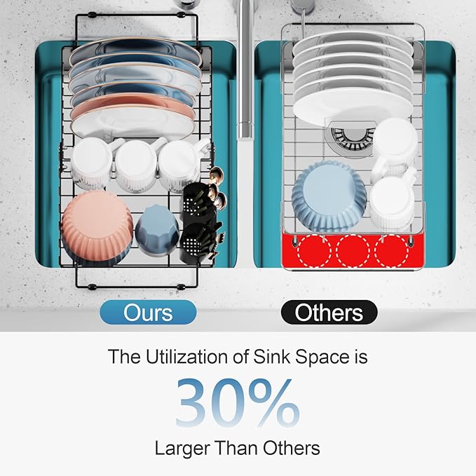 - [True Expandable, Real Capacity Boost] - Unlike other racks that only extend handles, our dish drainer expands as a whole unit—truly increasing your drying space, allowing you to comfortably hold at least 3 extra cups in addition to 6 plates, bowls, utensils, and even fresh fruits and veggies. This innovative design not only ensures perfect sink compatibility but genuinely maximizes your drying area.