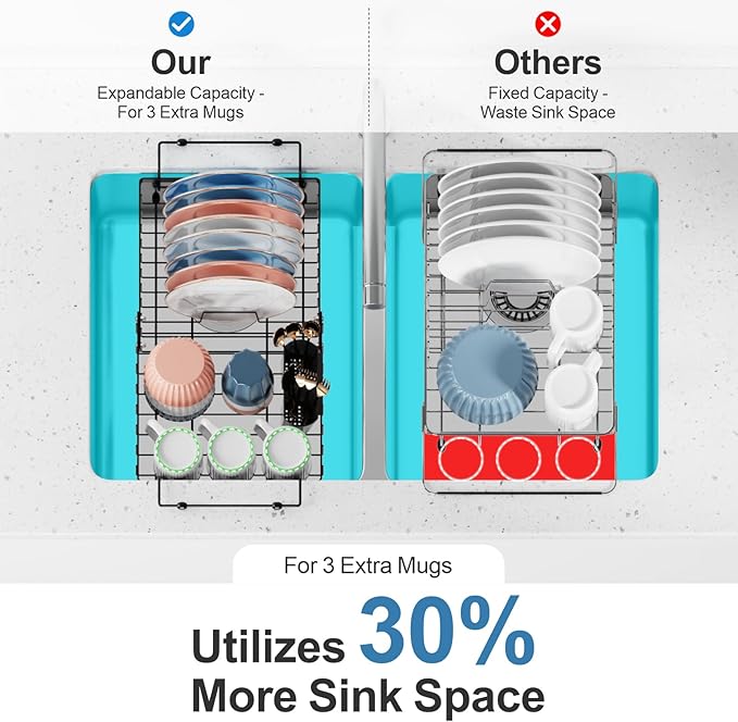- [Innovative "Expandable Capacity" Design] - Unlike other in sink dish drying rack that only allow for handle adjustments and waste space, ours can adjust the main body rack to increase 37% storage capacity. Product dimensions: (15.8''-20.7'') L x 12''W x 5.5''H(not including handle length); Sink Protector Size: 12.8" x 11.2"