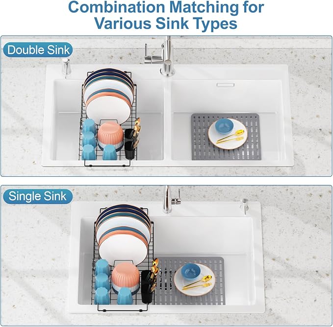 - [Multifunctional Capacity Storage] - This over the sink dish drainer drying rack can hold multiple plates, cups, bowls and cutlery. The over-the-sink design doesn't take up any counter space and allows water drip into the sink directly to avoid pooling of water, avoid the trouble of manual cleaning; The silicone sink mat is readily cut to align with the sink's drain hole as required, offering heat resistance up to 428°F