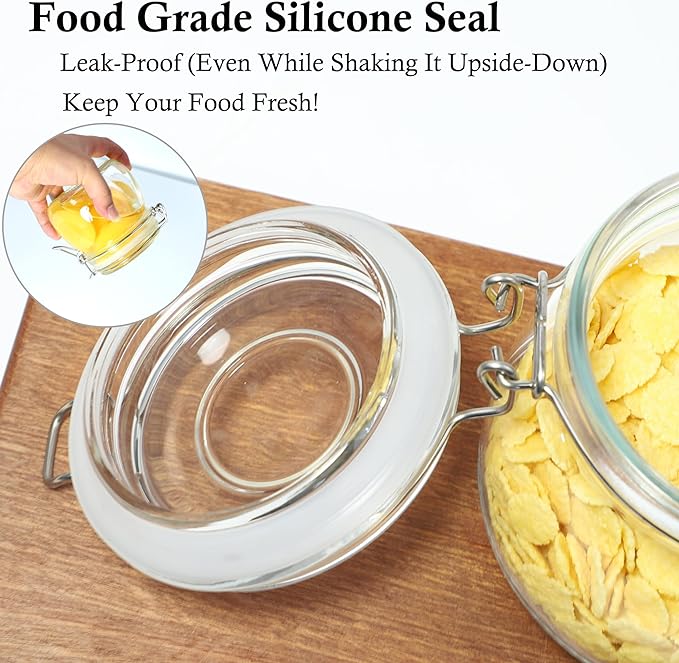 - LEAK PROOF & AIRTIGHT STORAGE - Glass food storage jar with silicone seal that will ensure not leak what so ever (even while shaking it upside-down). The top flip cap has a secure snap fit closure that can easy to open and close. Airtight container to keep your food fresh!