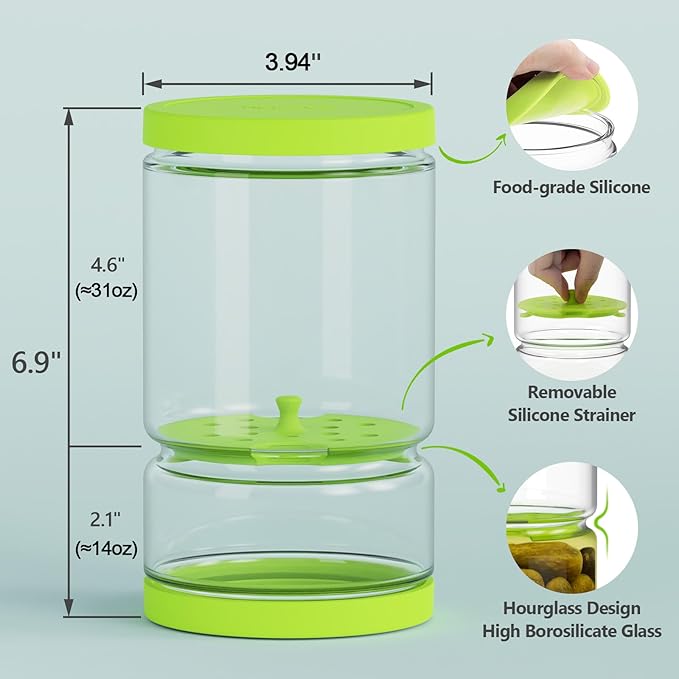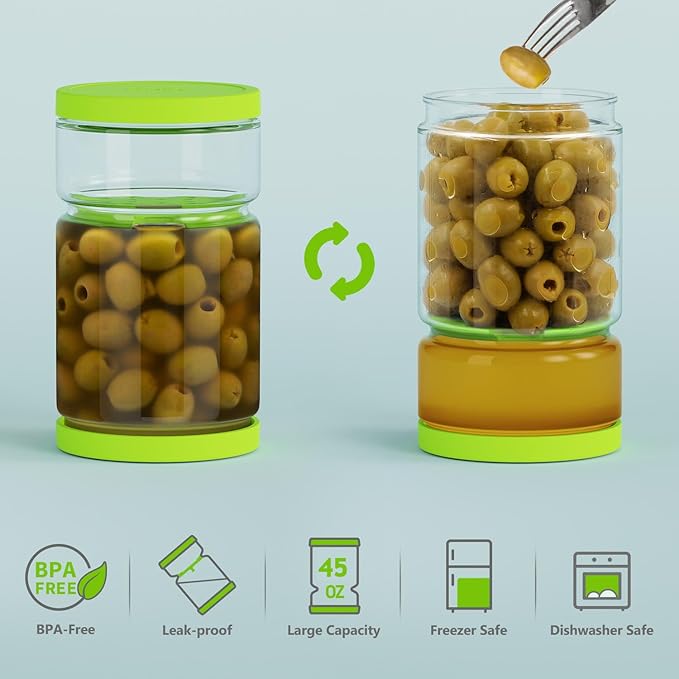 - Effortless Pickle Strainer: Perfect for brining, fermenting, and serving pickles, olives, jalapeños, and cocktail onions. The built-in pickle strainer allows mess-free draining while preserving flavorful brines. Ideal for meal serving and refrigerator organization.