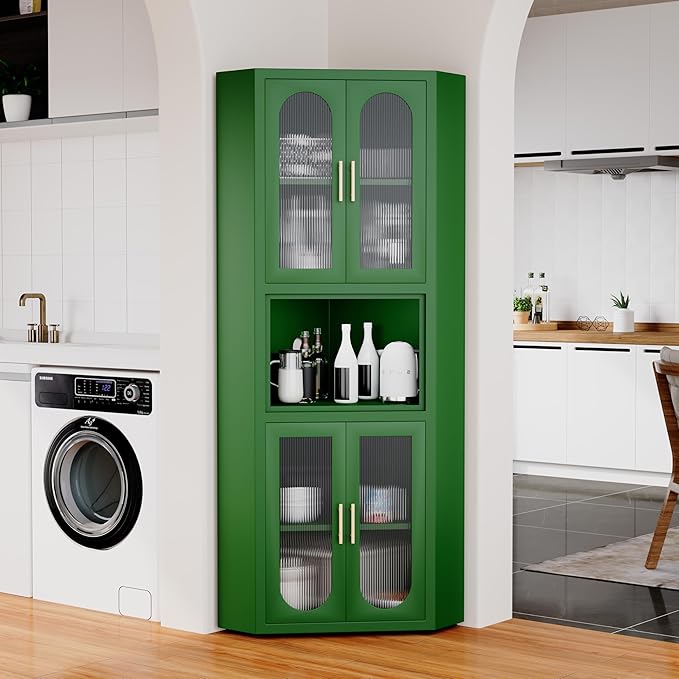 64" Tall Metal Corner Storage Cabinet with Acrylic Glass Doors & Open Display Storage Shelves, Farmhouse Corner Pantry Storage Cupboard for Kitchen, Laundry Room, Bathroom or Bedroom (Green)