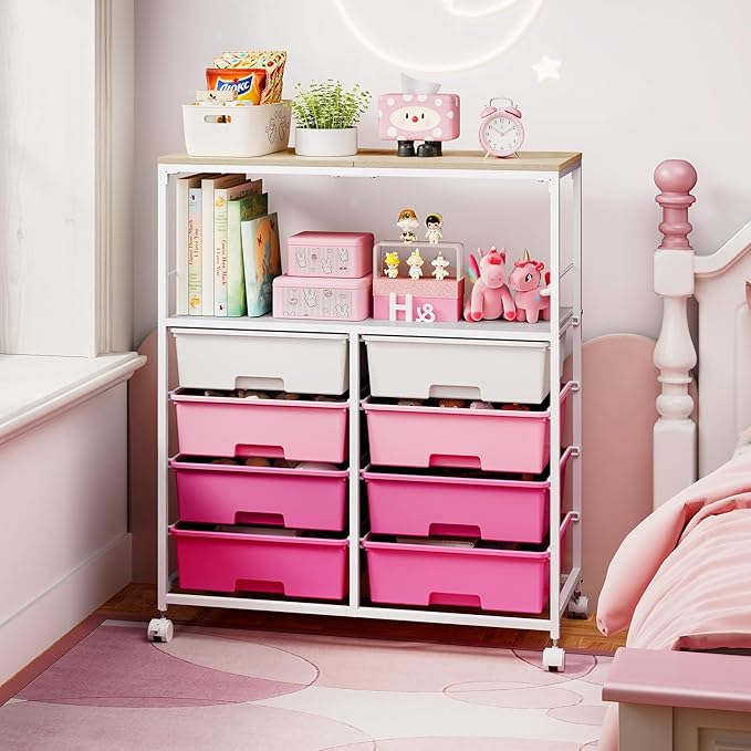 8 Drawers Rolling Storage Cart with Wooden Top, Multipurpose Utility Cart with Opening Shelf & Lockable Wheels, Storage Drawer Cart Organizer for Home Office Craft Room Classroom, Pink